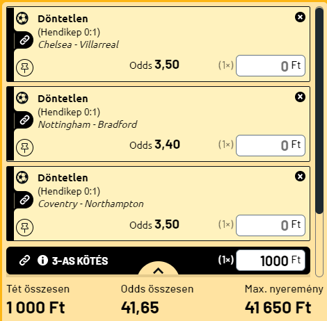 Ebben a rovatban mindig három mérkőzés szerepel majd. Mindegyik meccs erős hazai eséllyel bír, simán hármas szelvényben 4-6 körüli szorzót eredményez. Azonban ha kicsit csavarunk még a dolgon, nagyon komoly 40-60-szoros szelvények kerülhetnek ki! Egy rovat, két szelvény, nyerjünk együtt!