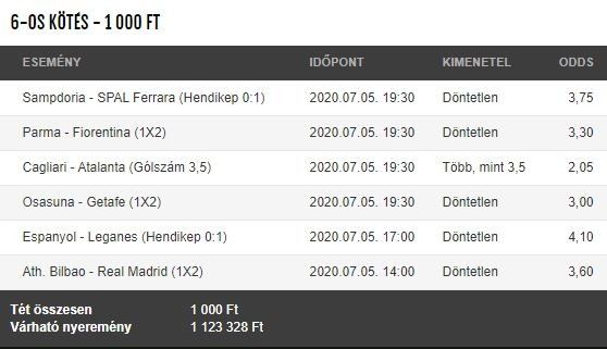 Szoros, egygólos győzelmet remélünk a Sampdoriától és az Espanyoltól, A Parma - Fiorentina, Osasuna - Leganés mérkőzéseken megosztozhatnak a pontokon a felek, míg a baszk csatacirkáló, az Athletic Bilbao is pontot rabol a bajnokságra törő Real Madridtól. Az Atalanta pedig idén szarja a gólokat, míg a Cagliari csapatában is vannak gólerős játékosok, így minimum négy gól is lehet a meccsen.