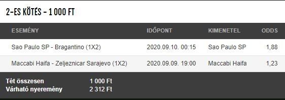 - A másik meccsem egy biztos mérkőzés az EL-selejtezőből, ahol a Maccabi Haifa hazai környezetben fogadja a Zeljeznicsart. Izraelben pedig nagyon nehéz megverni a hazai csapatokat, főleg ha még valamivel jobbak is.