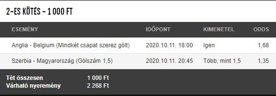 - Két mai meccset választottam ki a mai duplámhoz. Az egyik az A-divízióból való, az Anglia - Belgium mérkőzés, ahol a gólváltást preferálom. Két olyan alakulat találkozik ma, ahol több minőségi, igazán támadás-specifikus játékos is szerepel, ráadásul mindkét csapatra a támadójáték és a gólok jellemzőek.