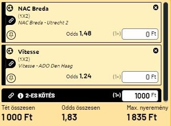- A szorzó nincs 2,0 de nagyon erős esélynek tartom mindkét hazai győzelmet. Az egyik a NAC - Utrecht 2. meccs, ahol a NAC egy vereség és egy döntetlen után van, a "kis" Utrecht pedig a 17. helyen áll. A hazaiak célja feljtuni az élvonalba ehhez pedig nemigen lehet már sokat bukni, ezeket a kötelezőket pedig hozni kell. Ezt biztosan hozzák is.