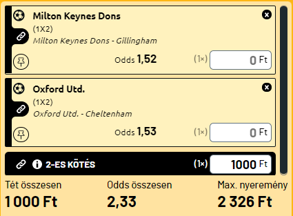 - A másik mérkőzés a 7. helyen álló MK Dons, amelynek a célja a playoff, de erre több hasonló erősségű csapat is pályázik, ezért a kötelező győzelmeket neki is hoznia kellene. Az Oxfordtól és a Sheffield Wednesdaytől kikaptak az elmúlt öt meccs valamelyikében, a Plymouth-szal szemben döntetlent játszottak. Mindhárom csapat ott van a közelben a tabellán és az erőviszonyokat tekintve jó csapatnak számítanak a Liga 1-ben. A 23. helyezett Gillingham nem számít annak. Sőt rossz csapatnak számít. Minden bizonnyal a kiesés lesz a sorsuk, az elmúlt öt meccsen még csak pontot sem szereztek. Ezen a meccsen is a hazai győzelem erős esély. A kettő együtt pedig már egy vastag duplázót eredményez.
