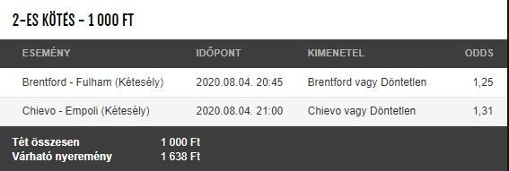 - Az első meccsen az angol Ligabajnokság rájátszásának döntője, ahol a Brentford a legjobb kezdőcsapatával otthon fogadja, a legjobbját (és kiemelkedő kulcsjátékosát) hiányában fellépő Fulham-et. Alapvetően is erősebb csapat a Brentford, így pedig, ráadásul otthon a győzelem a valószínű. Én 1X-et vettem, hogy minél biztosabb legyen.
