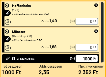 - A német kupából hozok két meccset. A Münster a Regionalliga nyugati csoportjának 4. helyén van. Viszont ezeknek a kiscsapatoknak, ahogyan nálunk is, mindig ünnep egy-egy ilyen kupameccs. Ilyenkor aztán ők mindent beleadnak és volt már több alkalommal is olyan, hogy megtréfálták a Bundesliga-csapatokat. A Hertha két győzelem után felosont a 10. helyre, három nap múlva pedig a Hoffenheim ellen játszik létfontosságú meccset Dárdai Pál csapata. Nem tudom, hogy kit és hogyan fog pihentetni a magyar szakvezető, de azt gondolom, a prioritás a bajnokság! Éppen ezért azt gondolom, ha nyer is a Hertha, semmiképpen nem fogja gólokkal verni a Münstert. Egy alap egygólos győzelem lesz valószínűleg. Ezen a meccsen a Münster 2-0-ás hendikepről bevitt győzelmét várom, vagyis az egygólos Hertha-győzelem még jó a fogadás szempontjából.