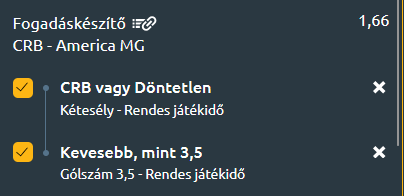 - A CRB otthon azért magabiztosan hozza a pontokat, az America MG pedig nem jeleskedik távol otthonától. Az 1x mellé betettük a -3.5 undert - vélhetően nem ma szakad ki egyik oldalon sem a gólzsák...