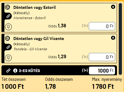 - A portugál bajnokságból hoztam egy szelvényt. Két olyan mérkőzés, ahol a vendégalakulat nem csak játékosállományban erősebb, hanem a forma és a tabellán is jóval előrébb helyezkednek el. A Tondelia - Gil Vicente és a Moreirense – Estoril meccs esetében is X2 a tippem, ami tekintve a csapatok közti különbséget, abszolút esélyes!