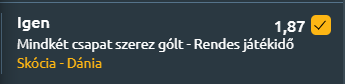 Egy Single Value Tipp következik, vagyis a sportfogadásban egy olyan értékelhető szorzó, amely single játékba küldés esetén is értéket hordoz magában! A skótoknak mindenképpen győzniük kell, hogy 28 év után újra kijussanak a tornára, míg a dánoknak elegendő egy döntetlen is ahhoz, hogy biztosítsák helyüket a 2026-os világbajnokságon.