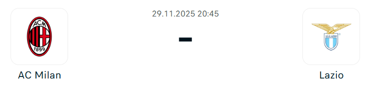 - A Lazio az elmúlt két idényben egyaránt hetedik lett, és jelenleg is hasonló helyen áll, hiszen 12 forduló után a nyolcadik pozíciót foglalják el 18 ponttal. A rómaiak célja ismét a nemzetközi szereplés kivívása, miután legutóbb a hetedik hely nem ért Európát a Bologna kupagyőzelme miatt. A legutóbbi, Lecce elleni 2–0-s siker után Maurizio Sarri elégedetten nyilatkozott a 65 percen át mutatott magas színvonalú futballról, ugyanakkor hozzátette, hogy nem kockáztattak többet a biztos eredmény érdekében. A Lazio idén eddig kizárólag az élmezőnyön kívüli csapatok ellen szerepelt jól, hiszen az AS Roma, az Inter és a Como elleni meccseiket együttesen 0–5-ös gólkülönbséggel veszítették el. A Lazio lényegesen hosszabb hiányzólistával készül, mint a Milan! Samuel Gigot, Matteo Cancellieri és Nicolo Rovella biztosan kimaradnak, Danilo Cataldi és Taty Castellanos játéka kérdéses. Castellanos ugyan visszatért az edzésekhez, de hosszú kihagyása miatt várhatóan nem lép pályára, helyét Boulaye Dia veheti át a csatársorban.