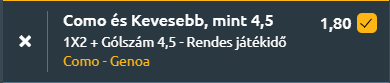 - Fabregas csapata kifejezetten erős a Sinigagliában, ráadásul a Genoa idegenben gyengén szerepel, és továbbra is gólképtelen a bajnokságban. A hazaiak szervezett játéka, támadósoruk kreativitása és Paz formája egyértelmű előnyt jelent. A Genoa védelme nem rossz, a támadási hatékonysággal vannak gondok. A Como várhatóan otthon tartja a három pontot, de nem lesz négy gólnál több a mérkőzésen.