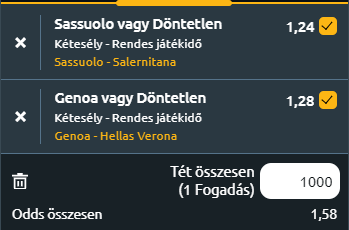 - Genoa - Hellas Verona: A Hellas Verona célja, hogy eltávolodjon a Serie A kieső zónájából, amikor péntek este a Stadio Luigi Ferrarisba utazik a Genoa ellen. Míg a házigazdák legutóbbi öt élvonalbeli mérkőzésükből csak egyet nyertek meg, a vendégek 10 meccses nyeretlenségi sorozatuknak szeretnének véget vetni minden sorozatban. Miután a Serie A-ban a Salernitana és a Coppa Italiában a Reggiana csapatát is legyőzték, a Genoa nem tudta megnyerni harmadik egymást követő mérkőzését, mivel a múlt hétvégén 2-1-es vereséget szenvedett a Cagliari otthonában. Pénteken egy szoros mérkőzésre van kilátás két olyan csapat között, akik mindketten nagyon szeretnének visszatérni a győztes útra. A két klub legutóbbi négy találkozójából három döntetlennel ért véget, de ma a hazaiakban van meg az a plusz támadásban, amellyel ma győzni lehet. Itt is esélyes a hazai siker, de rakjuk oda az X-et is.