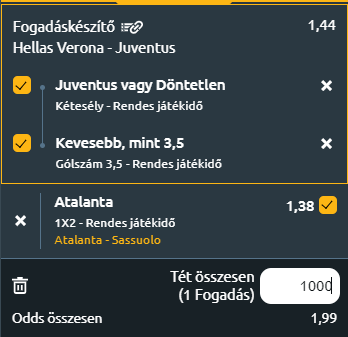 - Hellas Verona -Juventus: Miután az Intertől majd az Udinesétől is kikapott Juventus elmondható, hogy lemaradt az Inter mögött a bajnoki címért folytatott harcban. Természetesen a hét pontos hátrány még nem a világ, de az utóbbi hetekben mutatott teljesítmény egy kalap kaka volt! Ma mindenképpen javítani kell, mert ha nem, akár még lejjebb is csúszhatnak a tabellán! A Hellas idén mindössze egyszer nyert, és ezzel még inkább veszélybe került és egyre inkább tartani kell a kiesőzónától! A Juventus ellen 33 Serie A-mérkőzés óta győzelem nélkül áll a Verona és ma sem ők az esélyesek, ám az esélytelenség terhe és a hazai pálya előnye miatt, no meg a Zebrák elmúlt három meccsen mutatott formája miatt óvatosnak kell lenni! Max Allegri biztosan nem idegenkedik az egygólos győzelemtől és biztos, hogy ennek van a legnagyobb esélye, de a szelvény miatt egyrészt megtartom az X-et is, másrészt hozzárakom az under 3,5 gólt.