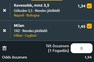 - Napoli – Bologna (8.-4.): A Serie A az egyike azon bajnokságoknak, amelyekben az 5. helyen végzett csapat is részt vehet a 2024-25-ös Bajnokok Ligája csoportkörében, amely már teljesen megújul majd! Így aztán egy győzelemmel megerősítheti helyét a Bologna a következő szezon Bajnokok Ligájában. Miközben a Bologna kiválóan szerepel és közel áll ahhoz, hogy az első ötbe kerüljön, a házigazdák az utolsó nyolc bajnoki mérkőzésükből csak egyet nyertek meg, és könnyen lehet, hogy teljesen lemaradnak Európáról! Kiegyenlített esélyekkel csap össze a két csapat ma, így leginkább a gólokra érdemes rámenni, de most under-szempontból! UNDER 3,5 GÓL a tipp!