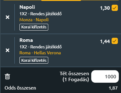 - Monza – Napoli: A bajnoki versenyfutásban feltámadó Napoli a sereghajtó Monza otthonába látogat, ahol a cél egyértelmű: győzelemmel pontszámban utolérni a listavezető Intert. A jelenlegi formák és helyzetek alapján Napoli toronymagas esélyesként utazik Monzába. Különösen Scott McTominay került fókuszba, aki döntő pillanatokban szerzett góljaival húzza csapatát előre. A bajnoki hajrában teljes figyelmüket a Serie A-ra összpontosíthatják, szemben az Inter háromfrontos terhelésével. Ezzel szemben a Monza gyakorlatilag már búcsút inthet az élvonalnak: 21 vereség, mindössze két győzelem, valamint az újra kinevezett Nesta irányítása alatt elszenvedett hat zakó nyolc meccs alatt mind azt mutatja, hogy a csapat önbizalom és szervezettség híján van. A legutóbbi vereség a 19. helyezett Venezia ellen végképp megpecsételhette a sorsukat. Biztos Napoli-győzelem váraható.
