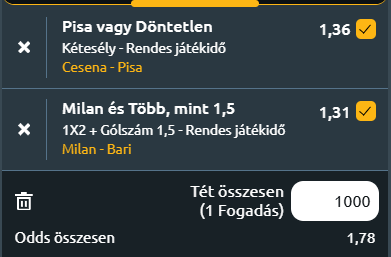 - Cesena – Pisa: Az Olasz Kupában találkozik a a Cesena és a Pisa, a győztes a második körben a Modena vagy a Torino ellen folytathatja. A Cesena tavaly szeptemberben 1–0-s győzelmet aratott Pisában a kupa második fordulójában, amivel kiharcolta a nyolcaddöntős összecsapást az Atalanta ellen. Bár a bergamóiak ellen búcsúzott, addig a sorozatban a Padovát, a Hellas Veronát és a Pisát is felülmúlta, és most hasonló menetelésben reménykedik. A Pisa tavaly a Coppa Italiából a második körben esett ki, ami lehetőséget adott arra, hogy teljes erővel a feljutásra koncentráljon. A szezon végén a Sassuolo mögött másodikként zártak, és tízpontos előnnyel biztosították a visszajutást a Serie A-ba, ezzel három évtizedes várakozást zárva le. A Cesena ugyan hazai pályán erős és jó formában zárta a felkészülést, de a Pisa friss feljutóként komolyabb játékerőt képvisel, és motiváltan készül a szezonra. Minőségi különbség van a vendégcsapat javára, nem is kapnak ki a rendes játékidőben! X2 a tipp.