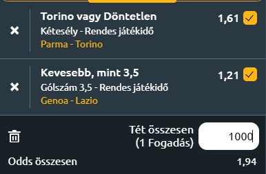 - Parma – Torino: A hazaiak nehéz rajtot vettek a szezonban, hiszen négy bajnoki mérkőzésen keresztül nyeretlenek maradtak, és mindössze két pontot gyűjtöttek. A legutóbbi találkozón gól nélküli döntetlent játszottak az újonc Cremonese ellen, ami a gólínségüket is jól mutatja, hiszen eddig csupán egyszer találtak be. Ez a gyenge kezdés az alsóházba sodorta a csapatot, jelenleg a kiesőzónában tartózkodnak. A vendégek a kupában a Pisa ellen jutottak tovább, miután Cesare Casadei góljával 1-0-ra nyertek. A bajnokságban azonban hullámzó formát mutatnak: négy forduló alatt két ponttal előzik meg Parmát, de eddig csupán egyszer tudtak nyerni. A legutóbbi bajnokin súlyos, 3-0-s vereséget szenvedtek Atalantától, előtte viszont idegenben értékes győzelmet arattak a Roma felett. A találkozó esélyese a Torino, amely bár két súlyos vereséget szenvedett a topcsapatok ellen, a közvetlen riválisokkal szemben eddig jobban szerepelt. A Parma gólszegény játéka és kiszámíthatatlan játéka komoly hátrányt jelent, különösen úgy, hogy az idényben eddig nem tudtak bajnokit nyerni. A vendégeknek több minőségi játékos áll a rendelkezésükre, és középpályán is nagyobb erővel rendelkeznek, ami döntő tényező lehet egy ilyen kiélezett helyzetben. A döntetlen mellett a vendégsiker esélyesebb.