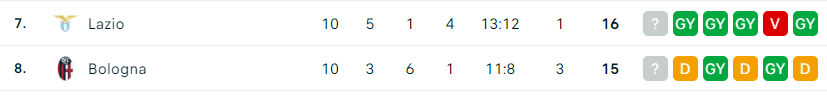 - A Lazio az előző szezon ezüstérmese volt, ehhez képest most csalódást keltő, hetedik helyen áll a tabellán, tíz lejátszott mérkőzésből 16 ponttal. Az utóbbi időben a római csapat javított a formáján, és jó eredménysorozatot produkál, az utolsó öt lejátszott mérkőzésén négy győzelmet aratott és egy vereséget szenvedett minden kiírást figyelembe véve. A Serie A előző fordulójában Maurizio Sarri csapata 1-0-s győzelmet aratott az Olimpicóban a Fiorentina ellen. Azon a mérkőzésen a házigazdák nehezen tudták megszerezni mindhárom pontot, hiszen csak a hosszabbításban sikerült nyerniük Ciro Immobile büntetőből szerzett góljával. A pénteken sorra kerülő mérkőzés újabb jelentős kihívás lesz a Lazio számára, különösen annak fényében, hogy a Biancocelesti a legutóbbi négy egymás elleni meccsükön nem tudta legyőzni a Bolognát a Renato Dall'Ara stadionban. Két vereséget és ugyanennyi döntetlent jegyeztek ezeken a mérkőzéseken.