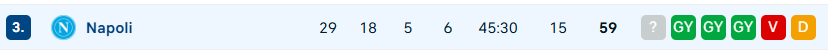 - A Napoli 29 mérkőzésen 59 pontot szerzett, 18-szor nyert, 5 iksz és 6 vereség mellett, miközben 45 gólt rúgott és 30-at kapott. Az idegenbeli teljesítmény azonban továbbra is aggasztó lehet Antonio Conte számára, már 6 vereség is áll a csapat neve mellett (8 győzelem, 1 döntetlen és 20:17-es gólkülönbség társaságában). A gárda legutóbbi túráin is megmutatkozott ez a következetlenség: Verona 1-2, Atalanta 2-1, Genoa 2-3, Juventus 3-0, Inter 2-2.