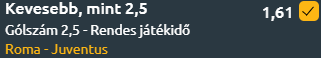 Az elmúlt 5 egymás ellenin nem nyert a Roma, 2 Juve-siker és 3 döntetlen született, 1,6 a gólátlag, tehát kevésgólos mérkőzéseket jtászanak egymással. Az elmúlt 7 egymás ellenin nem esett 3,5-nél több gól, 2,5-nél több is csak egyszer esett!