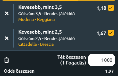 - Modena – Reggiana: A Modena–Reggiana összecsapáson a hazai pályán játszó Modena az esélyesebb, ami a tabellán elfoglalt 9. helyéből is látszik, szemben a kiesőzónához közeli, 18. helyen álló Reggianával. Bár mindkét csapat győzelemmel hangolt, a Reggiana védelme gyengébb, az utóbbi öt meccsén 2.4 gólt kapott átlagban, míg a Modena kiegyensúlyozottabb formát mutat, és több győzelmet is elért a közelmúltban. Az egymás elleni múlt szintén Modena-fölényt mutat, idegenben is legyőzték legutóbb a Reggianát, és a közös meccseken is jobb gólkülönbséggel zártak. A statisztikák kevés gólt és alacsony gólváltási esélyt jeleznek, a vendégek biztosan a védekezésre fog összpontosítani és a hazai csapat ereje is elsősorban a jó védekezésre alapul. Így összességében taktikus, szoros mérkőzés várható, ahol a hazai győzelem és a döntetlen (kisebb) esélye mellett, a legjobb sansz a kevés gólra van. Tipp: Kevesebb, mint 3,5 gól a mérkőzésen.