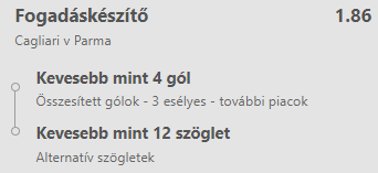 Ez a rovatom a Fogadáskészítő segítségével készült el. Az adott mérkőzést kielemezve 2-3 szempontból összeállított tippet küldök játékba, amelynek szorzója minden esetben a duplázó körüli értéket közelíti, de mégis jó esélyekkel indul! Az indoklást rendhagyó módon távirati jelleggel csinálom. Nincs fölösleges sallang, csak a sziklaszilárd tények. A Cagliari arra törekszik, hogy a hazai pálya előnyét kihasználva pozitív eredményt érjen el a Serie B rájátszás elődöntőjének kedd esti, Parma elleni első mérkőzésén.