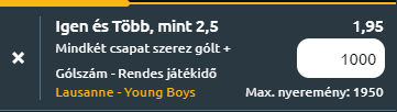 - A Young Boys minden tekintetben felülmúlja a hazai gárdát, de a Lausanne otthon képes jó teljesítményre is és mivel ma teljesen felszabadultan, győzelmi elvárás nélkül meccselhetnek kijöhet egy jobb teljesítmény, ami gólt jelent.