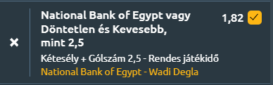 Egy Single Value Tipp következik, vagyis a sportfogadásban egy olyan értékelhető szorzó, amely single játékba küldés esetén is értéket hordoz magában! Két formán kívüli csapat csap össze az Egyiptomi Ligakupában, ahol a továbbjutási esélyek életben tartása érdekében a National Bank of Egypt és a Wadi Degla is győzelmi kényszerben lép pályára, ám valós esélye csak az egyiküknek van.