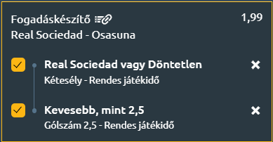 - Mire számíthatunk mindezek alapján? A Real Sociedad az egymás elleni mérkőzések és a hazai pálya alapján valamivel esélyesebb, ráadásul az Osasuna idegenben nem túl eredményes. Szoros meccs várható kevés góllal, ahol a Real Sociedad minimum a döntetlent tartja majd.