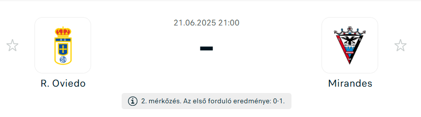- A Real Oviedo együttese a teljes 2024/25-ös idény során folyamatosan közel állt a közvetlen feljutást jelentő helyekhez, ám végül két ponttal lemaradtak róla. A klub 2001 óta vár arra, hogy ismét a spanyol élvonalban szerepelhessen, így érthető, hogy rendkívüli motivációval próbálnak ma játszani! Az első mérkőzésen elszenvedett 1–0-s vereség ellenére a csapatban erős a hit a sikerben, Dani Calvo védő úgy fogalmazott, hogy „meg vagyunk győződve róla, hogy feljutunk. Ez az Oviedo éve”. A Mirandés idén valóságos meglepetéscsapatként robbant be a feljutásért folyó harcba, hiszen a szezon elején kevesen számoltak velük komoly esélyesként. Végül ugyanannyi pontot szereztek, mint Oviedo, és hasonlóan szoros különbséggel csúsztak le az automatikus feljutásról. A klub történetében még sosem szerepeltek a La Ligában, így a Miranda de Ebro városából érkező szurkolók számára történelmi lehetőség küszöbén áll a csapat. Az első találkozón elért 1–0-s siker fontos előnyt jelent, hiszen egy döntetlen is elég lenne a továbbjutáshoz. Ugyanakkor Alessio Lisci vezetőedző óvatosságra intett, tudják, hogy Oviedo bármikor képes lehet betalálni, így nem számítanak az előny megtartására, hanem ismét győzni szeretnének.