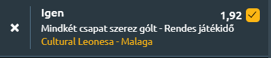 - Mire számíthatunk mindezek alapján? A Cultural Leonesa hazai pályán némi előnyben lehet, hiszen képesek gólokat szerezni, míg a Málaga idegenbeli mérlege gyenge. Ugyanakkor a hazaiak ingadozó formája miatt nem garantált a három pont megszerzése. A statisztikák és a közelmúlt eredményei alapján a legvalószínűbb kimenetel, hogy mindkét fél betalál majd.