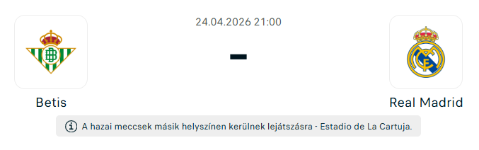 - A Real Betis nincs éppen a topon a formát illetően. Az Európa-ligában csalódást keltő módon búcsúztak a negyeddöntőben a Braga ellen, ugyanakkor a bajnokságban kedden 3–2-es győzelmet arattak a Girona otthonában. Manuel Pellegrini együttese 32 mérkőzésen 12 győzelmet, 13 döntetlent és 7 vereséget számlál, ami 49 ponttal az ötödik helyre elegendő, ráadásul öt ponttal előzik meg a hatodik Celtát az Európa-ligás pozícióért folytatott harcban. A sevillai gárda hazai pályán kifejezetten eredményes, 15 meccsen 26 pontot gyűjtött, és mindössze három vereséget szenvedett. Tavaly 2–1-re legyőzték a Realt, de idén januárban 5–1-es vereségbe szaladtak bele a Bernabéuban, ugyanakkor az utóbbi hat bajnokin csak kétszer kaptak ki a madridiaktól, három döntetlen mellett. A keretben is vannak mozgások, Antony visszatér eltiltás után, Abde Ezzalzouli kiváló formában van, míg sérülések is nehezítik a helyzetet, de összességében erős összeállítás várhatja a vendégeket.