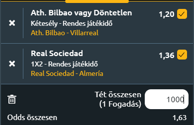 - Real Sociedad – Almeria: A Real Sociedad jelenleg a hatodik helyen áll a La Liga tabelláján, öt ponttal megelőzve a hetedik helyen álló Valenciát, míg az Almeria 15 pontra van a biztos 17. helytől. Imanol Alguacil mester célja, hogy négy győzelmet szerezzen zsinórban csapatával a spanyol élvonalban, amikor vasárnap este az alulmaradt Almeria otthonában folytatja a bajnokságot. Nem olyan nagyon gyenge az Almeria, de a Real Sociedad most nagyon jó formában van. Hazai győzelem várható!