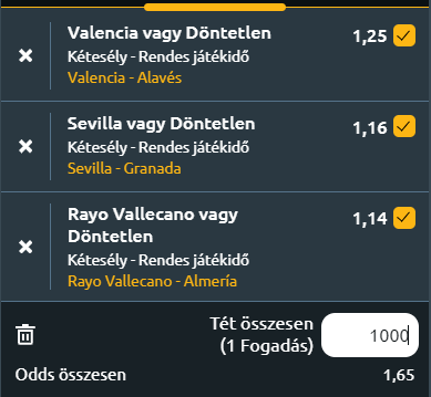 - Valencia -Alaves: Sorozatos vereségek után szeretne a Valencia visszatérni a győztes útra, amikor az Alavest fogadja hazai környezetben. A Valencia a tabella nyolcadik helyén áll, két ponttal lemaradva a hetedik Real Betis mögött, míg az Alaves a 12. helyen áll, 12 pontra a kieső zónától, öt mérkőzéssel a vége előtt. Az Alavest nem szabad lebecsülni, képes lehet meglepetésre, de alapvetően a Valencia támadási képességével és a hazai pálya előnyével mindenképp esélyesebb. Hugo Duro pedig potenciálisan tovább növelheti a 13 bajnoki gólt, amit ebben a szezonban már elért. A hazai győzelem mellett a döntetlent is figyelembe vesszük ma. Ez egy óvatos szelvény!