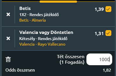 - Valencia - Rayo Vallecano (8.-17.): A Valencia hárommeccses vereségsorozatának szeretne véget vetni a La Ligában, amikor vasárnap este a Rayo Vallecanót fogadja a Mestallában. A Valencia négy ponttal van lemaradva a 7. helytől, ami már európai kupaindulást jelent, de van még hátra négy forduló, ami alatt ezt be lehet hozni. De nyilván nem könnyű, hiszen nem csak a saját kezükben van a sorsuk. A Rayo a 16. helyen áll a tabellán, és még nem garantált a helye az élvonalban a 2024-25-ös idényre. A Valenciának szüksége van egy győzelemre, hogy növelje európai reményeit, és mivel a Rayo csak szenved és nagyon nehéz helyzetben van, erre a győzelemre minden reménye meg is van. Ennek ellenére a döntetlent, óvatosságból, figyelembe vesszük. 1X