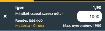 - A Girona a kiemelkedő szériája ellenére kihívásnak néz elébe a Mallorca ellen, különösen, ha figyelembe vesszük, hogy a Mallorca hazai pályán félelmetes ellenfél hírében áll. A meccsen a Girona a favorit, de ezt a Mallorcát vétek lenne lebecsülni. Egy jó kis gólváltós meccset várhatunk ma tőlük.