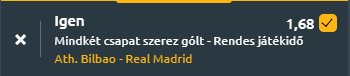 - A Realnak komoly nyomással kell szembenézni a San Mamésben, így várhatóan nem tudják megúszni kapott gól nélkül. A madridiak világklasszis támadósora viszont szinte garantáltan betalál majd, így a gólváltásnak igencsak jó esélye van!