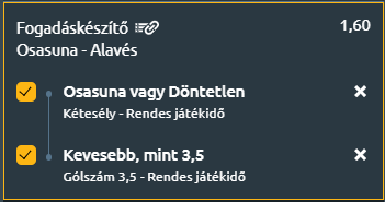 - Mindkét gárda a szilárd és stabil védekezéséről-, valamint a gyengébb támadási hatékonyságáról híres. Az Osasuna valamelyest esélyesebb a hazai pálya előnye és a jobb forma miatt. Ezen erős érvek alapján a tipp egy fogadáskombináció: 1X + kevesebb mint 3,5 gól a mérkőzésen