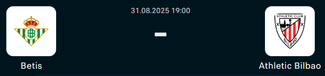 Vasárnap este az Estadio de La Cartujában fogadj a Real Betis az Athletic Bilbaót. A tavalyi Konferencia-liga döntőse (idei El-résztvevő) egy idei BL-résztvevővel találkozik. A Betis 3 meccsen 5 pontot szerzett (szerdán volt egy előrehozott bajnokijuk a Celta Vigo ellen, 1-1), míg az Athletic Club (a Bilbao említése helytelen az Athletic megnevezés nélkül) 100%-os mérleggel áll a Rayo Vallecano és a Sevilla legyőzése után.