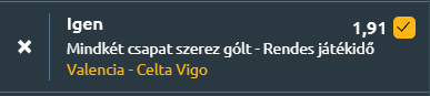 - A hazaiak súlyos, 7-1-es vereséget szenvedtek a Barcelonától, ami komoly csapást mért a csapat moráljára, ugyanakkor az ezt megelőző időszakban voltak biztató jelek a teljesítményükben. A Mestallában idén 10 hazai meccsen 12 pontot gyűjtöttek, így saját közönségük előtt képesek lehetnek eredményes játékra. A Celta viszont idegenben gyengén szerepel, hiszen 10 bajnoki mérkőzéséből csak egyet tudott megnyerni a szezonban. Ennek ellenére támadásban mutatott már életjeleket: 2025-öt egy 3-2-es kupagyőzelemmel kezdte, majd az Alavés ellen is betalált egy 1-1-es döntetlen során. A két csapat legutóbbi találkozásán Celta 3-1-re nyerni tudott, ami bizonyítja, hogy képesek feltörni a Valencia védelmét és erre ma is megvan az esély! A hazaiaknak pedig muszáj lesz reagálniuk az előző heti kiütéses vereségre, így támadásban is aktívak lesznek, ami gólt eredményezhet. A jelenlegi helyzet és a korábbi eredmények alapján mindkét együttes képes lehet gólt szerezni ezen a meccsen.