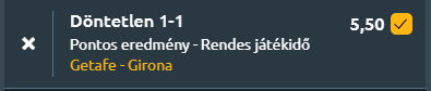Egy Single Value Tipp következik, vagyis a sportfogadásban egy olyan értékelhető szorzó, amely single játékba küldés esetén is értéket hordoz magában! A La Liga 11. fordulójában csap össze a két kupafordulóból továbbjutó csapat, a középtájon álló Getafe és a sereghajtó pozícióból menekülő Girona.