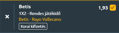 Egy Single Value Tipp következik, vagyis a sportfogadásban egy olyan értékelhető szorzó, amely single játékba küldés esetén is értéket hordoz magában! Hazai pályán folytatná győzelmi sorozatát a Real Betis, amely a Rayo Vallecano ellen lép pályára a La Ligában. A sevillaiak az ötödik helyen állnak és a BL-indulás a cél, míg a vendégek a 17. helyről menekülnek a kiesőzóna elől.