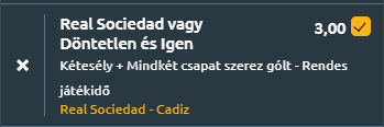 - A Real Sociedad nincs jó formában, az utolsó nyolc meccsén legalább egy gólt kaptak, viszont az elmúlt hat meccsükön mindig rúgtak legalább egyet. Mindkét csapat komoly szándékkal fut ki a pályára, a gólváltásra komoly esély van, de ha hazai pályán a Real Sociedad legyőzné, vagy döntetlent játszana a Cadizzal és ehhez kötjük hozzá a gólváltást, akkor egy egészen komoly 3,00-ás szorzót kapunk! Azért ki csak nem kap a Real Sociedad!