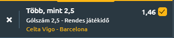 - A mérkőzésen több mint 2,5 gól várható, és ennek számos oka van. A Celta Vigo támadójátéka idén kimagasló, különösen hazai pályán, ahol már négy győzelmet szereztek. A védekezésük viszont gyenge, ami különösen veszélyessé teszi a Barcelona ellen, hiszen a vendégek támadósora a legjobb a bajnokságban. Lewandowski visszatérése további fenyegetést jelent, míg Iago Aspas a Celta húzóembereként mindig képes a gólra. Mindkét csapat sebezhető a védekezésben, de támadásban egyaránt képesek gyors és látványos játékra. Ezért egy gólgazdag mérkőzés valószínű.