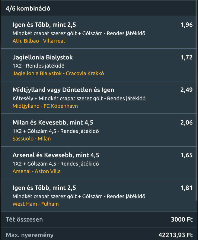 - Az Arsenal kedden hazai pályán döntetlent ért el a Bayern München ellen a Bajnokok Ligájában, ez talán csalódás, mert Münchenben nem biztos, hogy ez elég lesz. Nyolc mérkőzésre hosszabbították meg veretlenségi sorozatukat minden bajnokságban, rendkívül offenzív és látványos támadójátékot játszanak, úgy, hogy mindemellett kiválóan védekeznek is! Kell is a jó forma a bajnokság hajrájában, hiszen nagy a verseny a bajnoki címért. Az Aston Villa formája az elmúlt hónapban visszaesett. Az utóbbi öt meccsükön mindössze egy győzelmet arattak, és két meccs óta nyeretlenek a Premier League-ben. A tabellán az 5. helyre csúsztak vissza, de ugyanannyi pontjuk van, mint a Tottenhamnek, és az az egy szerencséjük van, hogy a Tottenham-et bucira verték Newcastle-ben! Itt az Arsenal esélyesebb, hiszen egyrészt hazai pályán játszanak, másrészt minden pont kell a bajnoki címért. Az Aston Villa viszont erős ellenfél és nem fogják csak úgy ukk-mukk-fukk agyonverni. Nyer az Arsenal – kevesebb, mint 4,5 gól a mérkőzésen.