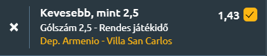 - Az argentin harmadosztályban (Primera B Metropolitana) jellemzően kevés gól esik, ami leginkább a csapatok defenzív szemléletének, szerényebb támadóképességeinek és rosszabb pályaviszonyainak tudható be. A klubok gyakran szoros meccsekre rendezkednek be, ahol az eredménybiztonság mindennél fontosabb, így kevés a kockázatvállalás, kevés a nyílt játék. Emellett a játékosok technikai színvonala elmarad a felsőbb osztályokétól, és ez a támadójáték minőségére is hatással van. A Deportivo Armenio – Villa San Carlos mérkőzésen pontosan minden áll, amit az imént felsoroltam! A hazai Armenio meccsein rendre a taktikai fegyelem dominál, stabil védekezésre építenek, támadásaik inkább óvatosak, mint kockázatvállalóak. Hasonlóan konzervatív felfogás jellemzi a vendég Villa San Carlost is, amely idegenben különösen zártan játszik, elsődlegesen a pontszerzést célozva, nem pedig a látványos futballt. A két csapat között rendszerint szoros, kevés helyzettel tarkított találkozók alakulnak ki, és egyik fél sem tartozik a bajnokság gólképes együttesei közé. Ha ehhez hozzávesszük a tétet, hiszen mindkét csapat a tabella középmezőnyében szeretne stabilan maradni –, könnyen belátható, hogy óvatos, zárt mérkőzés várható, ahol 2,5 gólnál többre kicsi az esély.