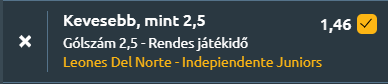 - Az ecuadori másodosztály mai játéknapján a tabella élmezőnyéhez tartozó Leones del Norte hazai pályán fogadja a hetedik helyen álló Independiente Juniorst az Estadio Olímpico de Ibarra stadionban. A mérkőzés esélyei kiegyenlítettek, szoros, taktikus meccs várható. A Leones del Norte utóbbi tíz meccséből kilencen nem esett három gólnál több, ráadásul a legutóbbi találkozójuk 0-0-s döntetlennel zárult. Az Independiente Juniorsnál is hasonló a tendencia, tízből hét mérkőzésen maradtak 2,5 gól alatt. A két csapat egymás elleni mérlege is ezt a képet erősíti: az elmúlt öt meccsükön átlagban mindössze 1,6 gól született, ezek közül hármat az Independiente nyert meg, Leones egyet sem. Továbbá a Leones kiváló védekezéssel rendelkezik (csak 0,47 kapott gól meccsenként), és támadásban sem túl hatékony (1 gól/meccs), így egy zárt, kevés gólt hozó összecsapás várható, ahol nem lesz több, mint 2,5 gól a meccsen.