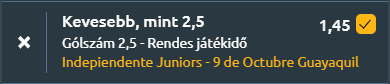 - Az ecuadori Liga Pro Serie B újabb fordulójában az Independiente Juniors hazai pályán fogadja a 9 de Octubre csapatát, két középmezőnybeli rivális találkozójáról van szó, szoros, taktikai meccs várható. Az Independiente Juniors esélyesebben várhatja a mérkőzést, hiszen hazai környezetben általában meggyőzőbb teljesítményt nyújt, az utóbbi hat találkozójából hármat megnyert, ami stabilabb formát jelez, mint a vendégek esetében. A 9 de Octubre ezzel szemben felemás teljesítményt mutatott, legutóbbi hat mérkőzéséből csak egyet tudott megnyerni, miközben többször is kapitulált védekezésben. Mindkét csapat számára jellemző a mérsékelt gólszám, de támadásban a hazai csapat jobb. A játékstílusok összevetéséből és a formai mutatókból kiindulva várható, hogy kiegyensúlyozott, de hazai fölényt hozó mérkőzés alakul ki, ahol egy-, esetleg két góllal nyer az Independiente és nem lesz több, mint 2,5 gól a meccsen.