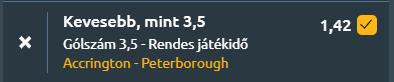 - Az Accrington Stanley hazai pályán fogadja a Peterborough United csapatát az EFL Kupa első fordulójában. A hazaiak célja, hogy javítsanak a hétvégi, Crewe Alexandra elleni 2-0-s vereség után, míg a vendégek az idény első győzelmére hajtanak. A párharc mindkét oldalon gyenge szezonkezdet után érkezik, és várhatóan feszes, kevés gólt hozó mérkőzés kerekedik belőle. A hazai Accrington Stanley a Crewe elleni találkozón nem tudott nagy helyzetet kialakítani, két kaput eltaláló lövésük is csak távoli próbálkozás volt. John Doolan együttese mindössze egy gólt szerzett a két bajnokin, és a 23 ellenfél tizenhatosán belüli érintésük a második legkevesebb a ligában. A vendég Peterborough United szintén gyenge rajtot vett, két bajnoki vereséggel kezdve az idényt, köztük a hétvégi, Luton elleni 2-0-s kudarccal. Darren Ferguson csapata sorozatban négy tétmeccsen kapott ki, és az azt megelőző három találkozón is csak döntetlent ért el. Az előjelek alapján egyik csapat sincs kimondottan jó formában, de az Accrington hazai pályán esélyesebb lehet a győzelemre. Mindkét fél támadójátéka erőtlen, a helyzetkihasználás gyenge, így várhatóan egy zárt, kevés gólt hozó mérkőzésre kerül sor. A Peterborough védekezése ingatag, de az Accrington sem mutatott átütőerőt, ezért nagy eséllyel 3,5 gól alatti eredmény születik, akár egyetlen találat is dönthet a továbbjutásról.