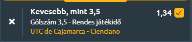 - A perui élvonalbeli bajnokság mai játéknapján UTC Cajamarca hazai pályán fogadja a Cienciano együttesét, kiegyenlített találkozóra van kilátás, ugyanakkor a statisztikák alapján inkább taktikai csata várható, mint gólzápor. A UTC Cajamarca jelenleg a Primera Division tabellájának 18. helyén áll, ami egyértelműen a szezon gyenge teljesítményét tükrözi. A csapat eddig mindössze hat győzelmet aratott, miközben tizenhat alkalommal vereséget szenvedett és nyolcszor döntetlent ért el. A támadójátékuk meglehetősen visszafogott, mérkőzésenként átlagosan csupán 0,87 gólt szereznek, miközben 1,67-et kapnak. Legutóbb október 3-án a Comerciantes Unidos ellen szenvedtek 2–1-es vereséget. A Cienciano a bajnokság kilencedik helyén áll, kiegyensúlyozottabb szezonbeli teljesítménnyel. Kilenc győzelem, kilenc vereség és tizenegy döntetlen szerepel a nevük mellett, ami stabil középcsapattá teszi őket. A támadósoruk hatékonyabb, mint a hazaiaké: átlagosan 1,55 gólt szereznek mérkőzésenként, míg 1,38-at kapnak. Legutóbb október 3-án a Melgar ellen maradtak alul 2–0-ra. A UTC Cajamarca gyenge támadójátéka, alacsony szezonbeli gólátlaga és a Cienciano idegenbeli visszafogottabb teljesítménye egyaránt arra utal, hogy nem valószínű látványos gólparádé. Bár a vendégek átlagosan több gólt szereznek, a védekezésük sem hibátlan, így inkább egy szoros, taktikai küzdelemre lehet számítani, ahol a csapatok óvatosan építkeznek, és a védekezés kerül előtérbe. Mindezek alapján indokolt az a várakozás, hogy a mérkőzésen kevesebb mint 3,5 gól születik.