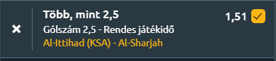- Szintén az ázsiai BL keretein belül kerül megrendezésre az Al Ittihad – Al Sharjah találkozó, ahol két, támadófelfogású, de védekezésben sebezhető csapat méri össze erejét. Az Al Ittihad legutóbbi találkozóján 4–4-es döntetlent játszott az Al Khaleej ellen, ami jól mutatja a csapat támadóerejét, ugyanakkor a védelem ingatagságát is. A szezonban átlagosan 1,67 gólt szereznek és 1,33-at kapnak meccsenként, tehát gyakoriak a nyílt, eseménydús mérkőzéseik. Az Al Sharjah ugyan legutóbb 2–0-ra kikapott a Shabab Al Ahli Dubai-tól, de az idei sorozatban átlagosan szintén 1,67 gólt lő és 3-at kap meccsenként, ami szintén a magas gólszám irányába mutat. A két csapat statisztikái alapján tehát egy kiegyenlített, támadásokban gazdag találkozóra lehet számítani, ahol mindkét fél képes lehet többször is betalálni, így a több mint 2,5 gól kimenetel valószínűsége kifejezetten erősnek tűnik.