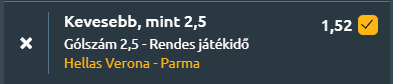- A Verona az elmúlt években rendszeresen a kiesés elől menekült, és a mostani szezon sem ígérkezik könnyebbnek, hiszen 11 forduló alatt mindössze hat pontot gyűjtött, és továbbra sincs meg az első győzelme. Az utóbbi három mérkőzésből kettőt elveszített, legutóbb pedig 0–0-ra végzett a Lecce otthonában egy kiegyenlített találkozón. A gyenge szereplés fő oka az eredménytelen támadójáték, hiszen Paolo Zanetti csapata mindössze hat gólt szerzett a bajnokságban, amivel a Serie A legrosszabb támadósora jelenleg. A Parma szintén nehéz idény elé néz, hiszen csak egy pont választja el a kiesőzónától, és az összes sorozatot figyelembe véve hat mérkőzés óta nyeretlen. A legutóbbi fellépésük azonban a szezon egyik legjobb teljesítménye volt, amikor hazai pályán 2–2-re mentettek egy már 2–0-ra elveszni látszó meccset az AC Milan ellen. A két együttes támadójátékának gyenge hatékonysága, a gyorsan összeomló formák és az egymás elleni gól nélküli előző találkozó alapján erősen indokolt, hogy a mérkőzésen kevesebb mint 2,5 gól szülessen.